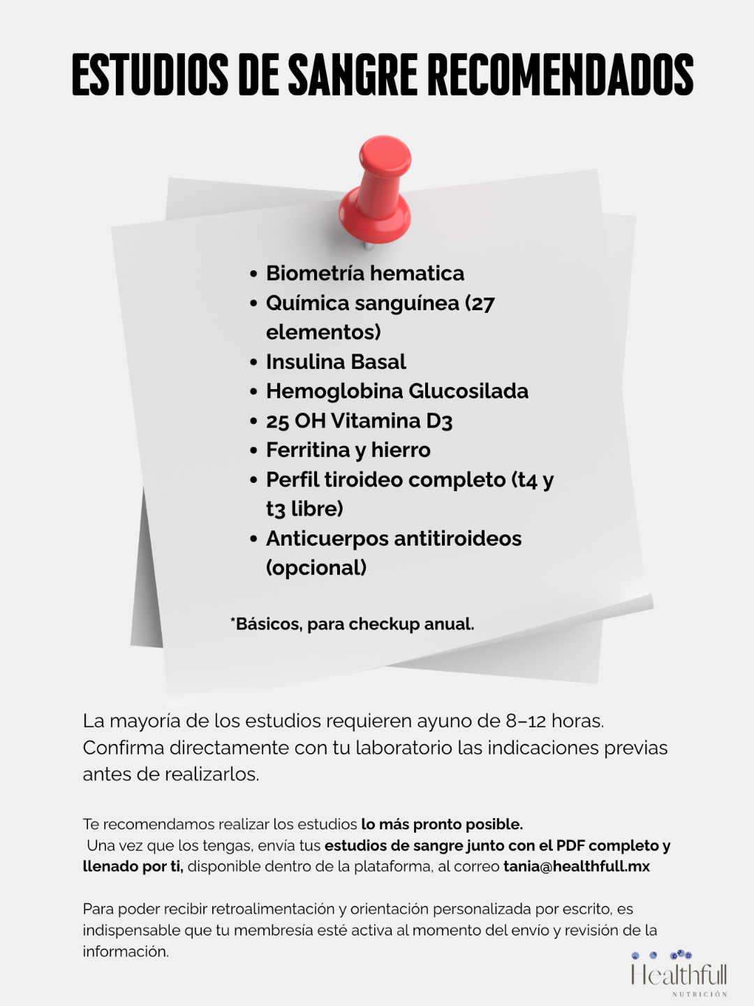 Aquí encontrarás los estudios de sangre recomendados y un PDF que te pedimos llenar para conocer mejor tu caso, tus objetivos y tu contexto actual.